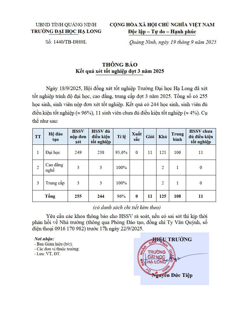 THÔNG BÁO Kết quả xét tốt nghiệp đợt 3 năm 2025