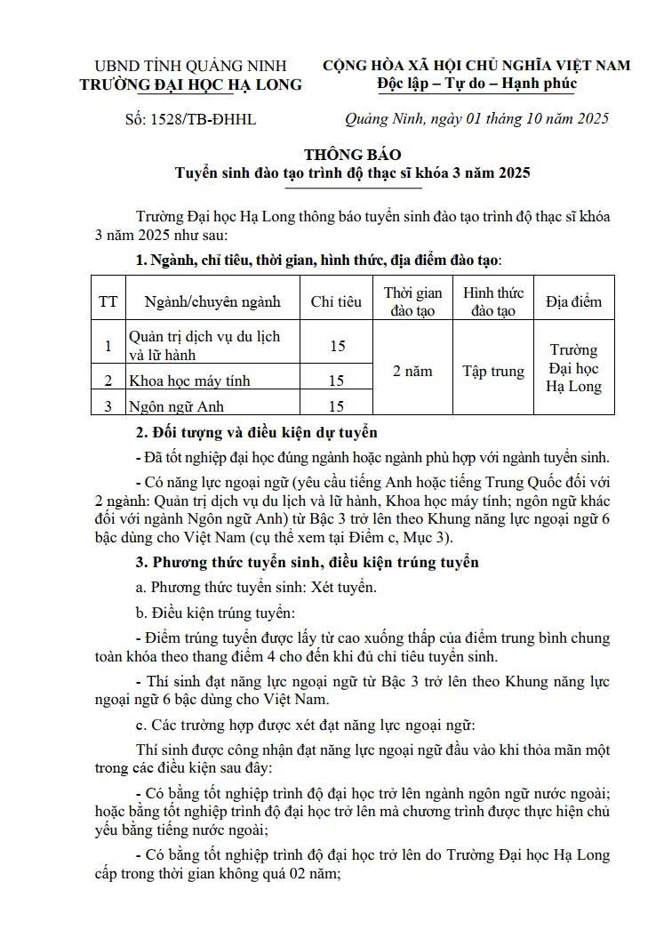 THÔNG BÁO Tuyển sinh đào tạo trình độ thạc sĩ khóa 3 năm 2025