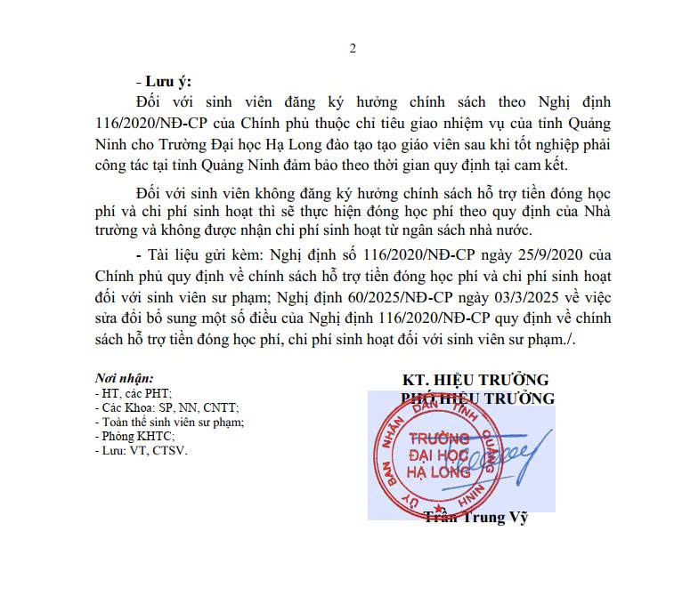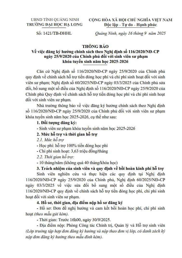 THÔNG BÁO Về việc đăng ký hưởng chính sách theo Nghị định số 116/2020/NĐ-CP ngày 25/9/2020 của Chính phủ đối với sinh viên sư phạm khóa tuyển sinh năm học 2025-2026