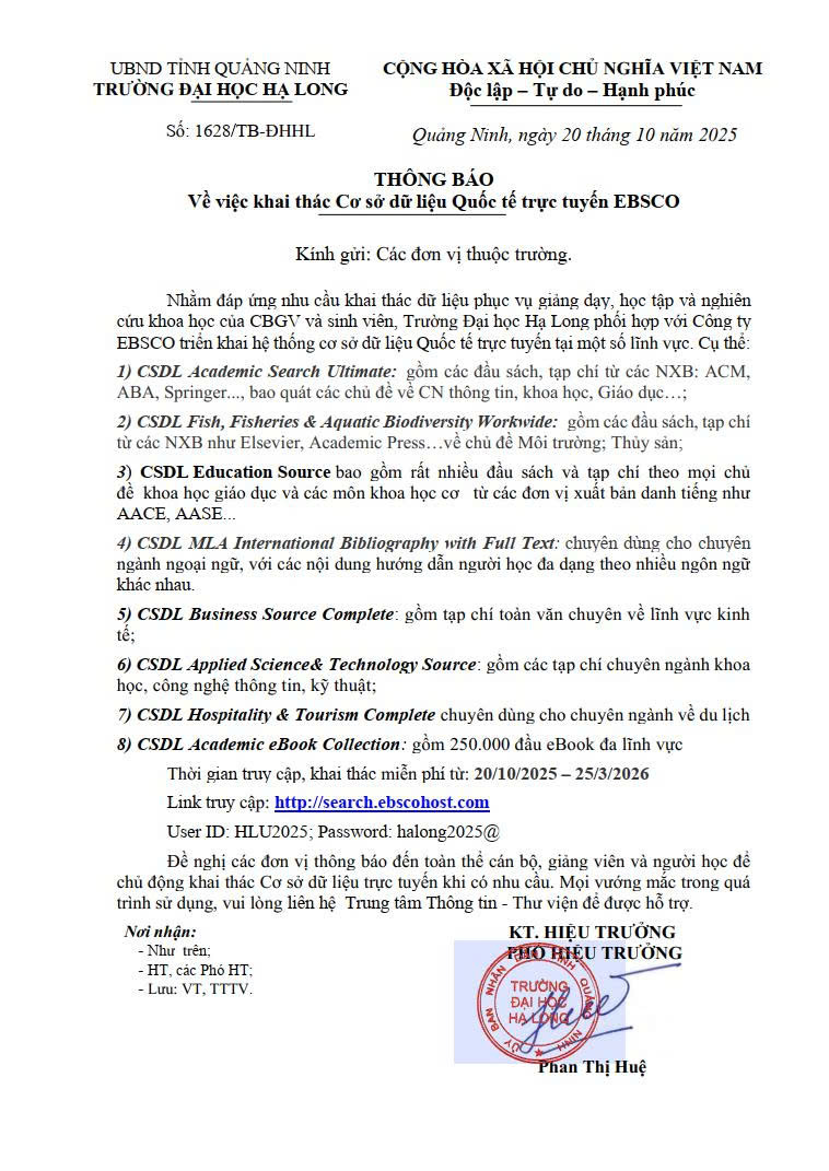 THÔNG BÁO Về việc khai thác Cơ sở dữ liệu Quốc tế trực tuyến EBSCO