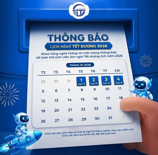 Thực hiện theo kế hoạch chung, Khoa Công nghệ thông tin trân trọng thông báo tới toàn thể sinh viên lịch nghỉ Tết Dương lịch năm 2026 như sau: