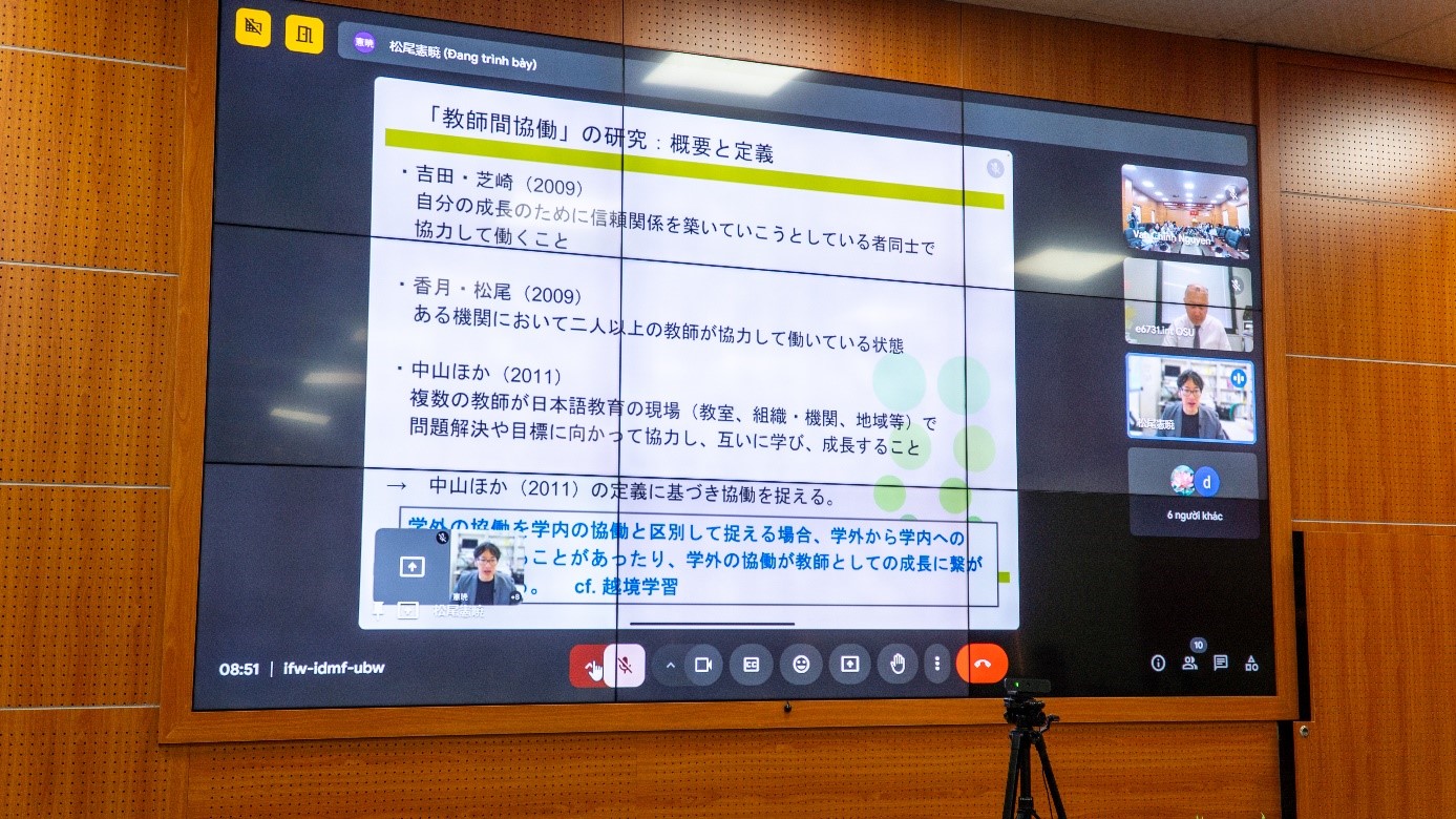 Đại diện nhà trường – thầy Nguyễn Quốc Tuấn, Trưởng Phòng Công tác chính trị, quản lý và hỗ trợ sinh viên (đứng ngoài cùng bên phải) lên nhận bằng khen giải thưởng tập thể