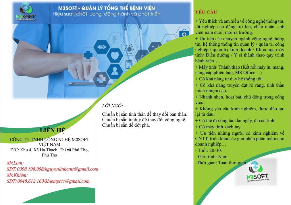 Công ty TNHH Công nghệ M3SOFT Việt Nam thông báo tuyển dụng vị trí Chuyên viên triển khai phần mềm y tế. Đây là cơ hội dành cho những ứng viên yêu thích công nghệ, sẵn sàng di chuyển và mong muốn góp phần vào quá trình chuyển đổi số trong lĩnh vực y tế.