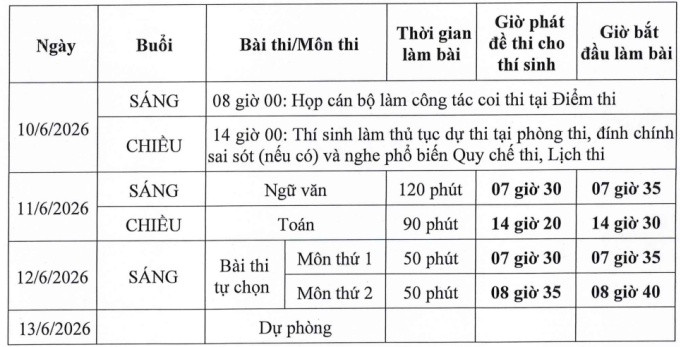 Ngày 11.6.2026, buổi sáng thí sinh làm bài thi môn Ngữ văn, thời gian làm bài 120 phút; buổi chiều thi môn Toán, thời gian làm bài 90 phút.