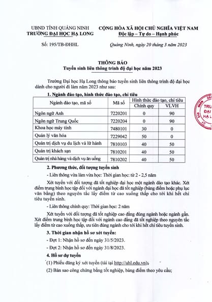 Thông báo: Tuyển sinh liên thông trình độ đại học năm 2023