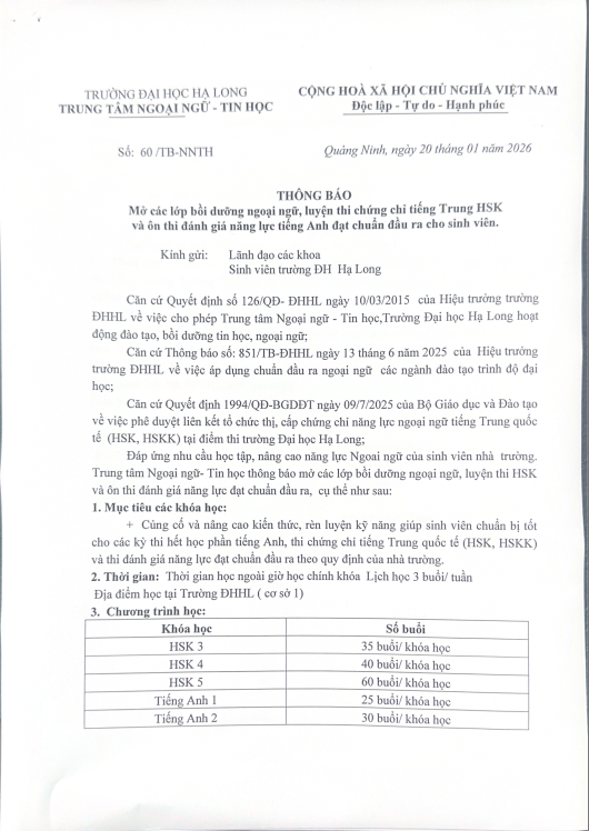 Thông báo lịch thi Năng lực tiếng Trung quốc tế HSK-HSKK 06 tháng đầu năm 2026 tại Đại học Hạ Long