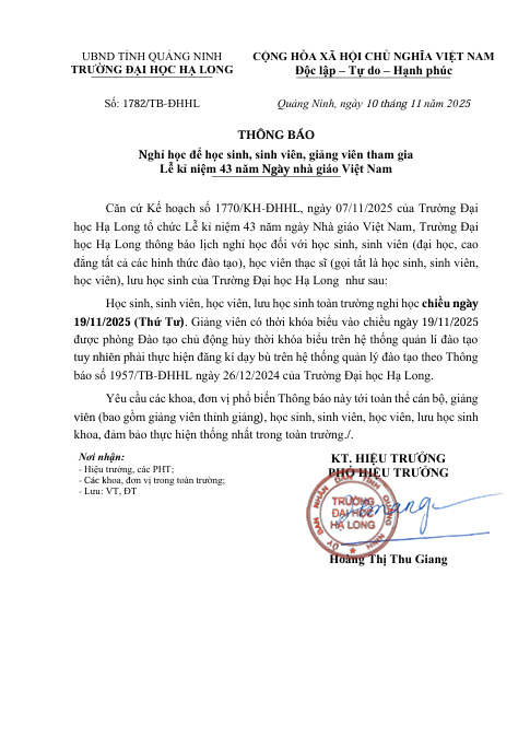 Thông báo nghỉ học để học sinh, sinh viên, giảng viên tham gia Lễ kỉ niệm 43 năm Ngày nhà giáo Việt Nam