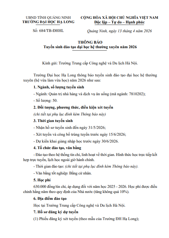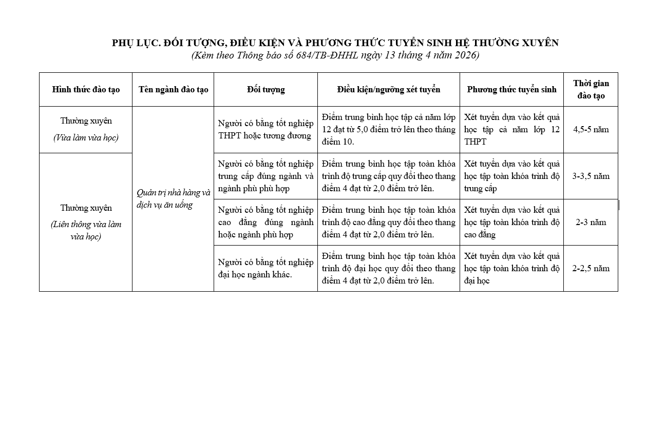 Thông báo tuyển sinh đào tạo đại học hệ thường xuyên năm 2026