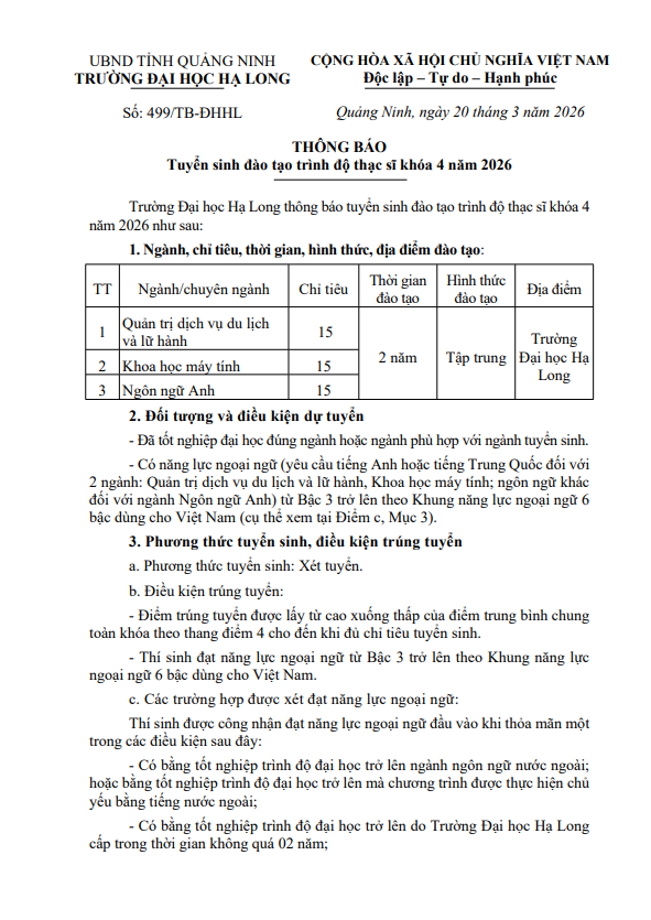 Thông báo tuyển sinh đào tạo trình độ thạc sĩ khóa 4 năm 2026