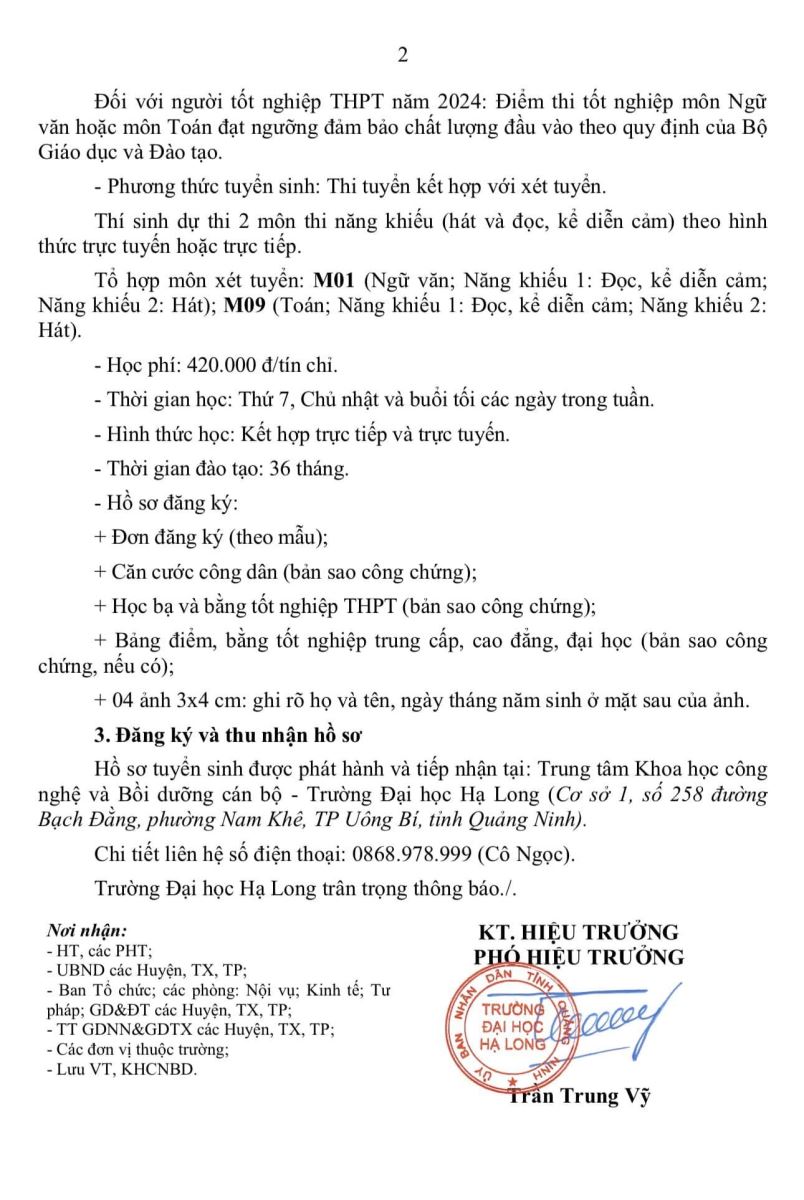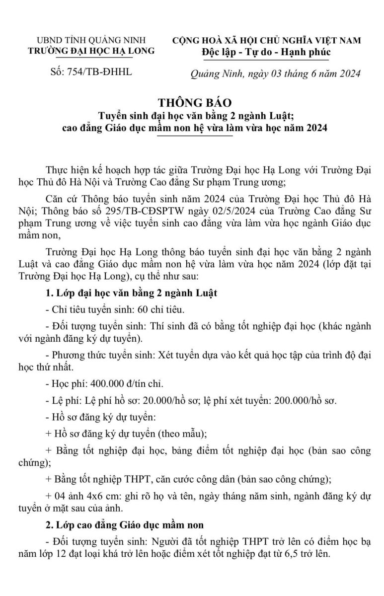 Trung tâm Khoa học, Công nghệ và Bồi dưỡng Cán bộ - Trường Đại học Hạ long Thông báo tuyển sinh lớp đại học VB 2 ngành Luật và lớp cao đẳng Giáo dục mầm non hệ VLVH năm 2024!