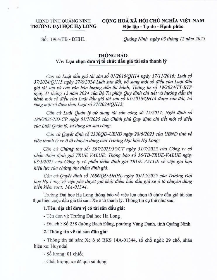 Trường Đại học Hạ Long Thông báo về việc Lựa chọn đơn vị tổ chức đấu giá tài sản thanh lý