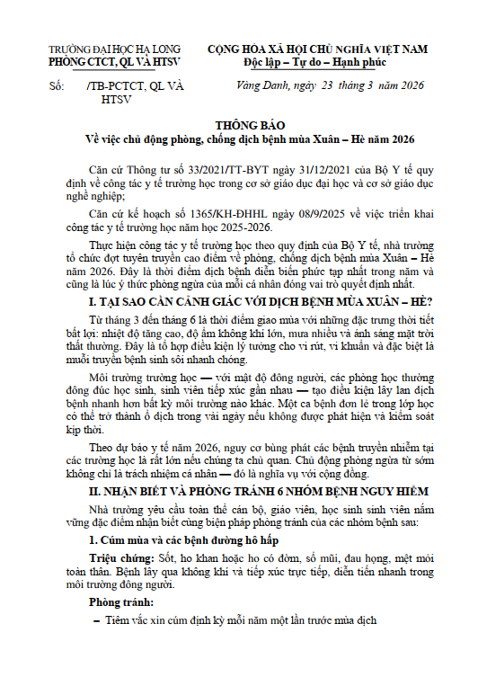 Thông báo về việc chủ động phòng, chống dịch bệnh mùa Xuân – Hè năm 2026