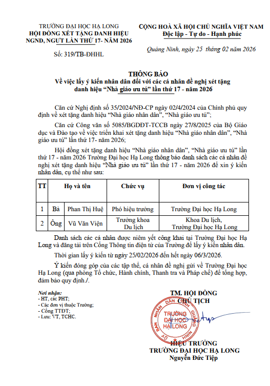 Thông báo về việc lấy ý kiến nhân dân đối với các cá nhân đề nghị xét tặng danh hiệu “Nhà giáo ưu tú” lần thứ 17 - năm 2026