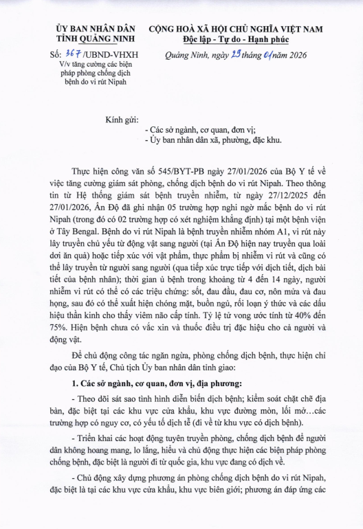 Thông báo về việc tăng cường các biện pháp phòng chống dịch vi rút Nipah