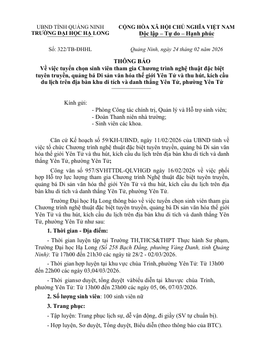 Thông báo về việc tuyển chọn sinh viên tham gia Chương trình nghệ thuật đặc biệt tuyên truyền, quảng bá Di sản văn hóa thế giới Yên Tử và thu hút, kích cầu du lịch trên địa bàn khu di tích và danh thắng Yên Tử, phường Yên Tử
