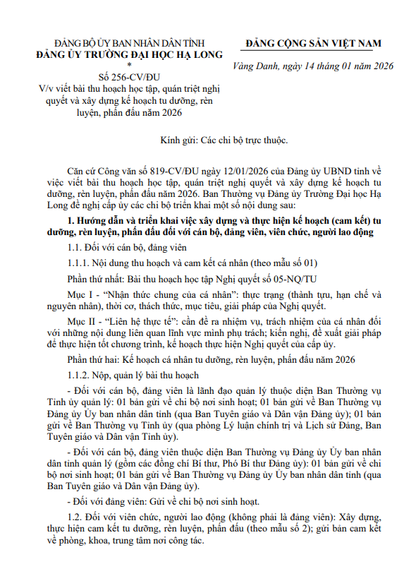 Thông báo về việc viết bài thu hoạch học tập, quán triệt nghị quyết và xây dựng kế hoạch tu dưỡng, rèn luyện, phấn đấu năm 2026