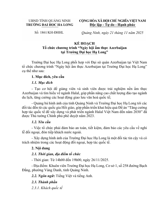 Thông báo v/v tổ chức chương trình "Ngày hội ẩm thực Azerbaijan tại trường Đại học Hạ Long"