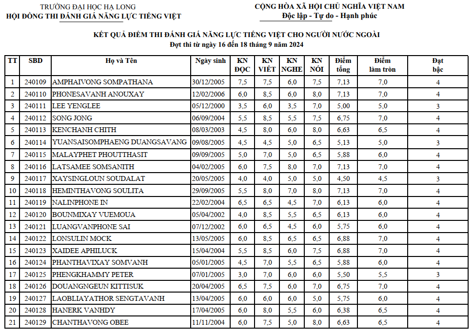 Kết quả điểm thi đánh giá năng lực Tiếng Việt cho người nước ngoài (đợt thi 16-18/9/2024)