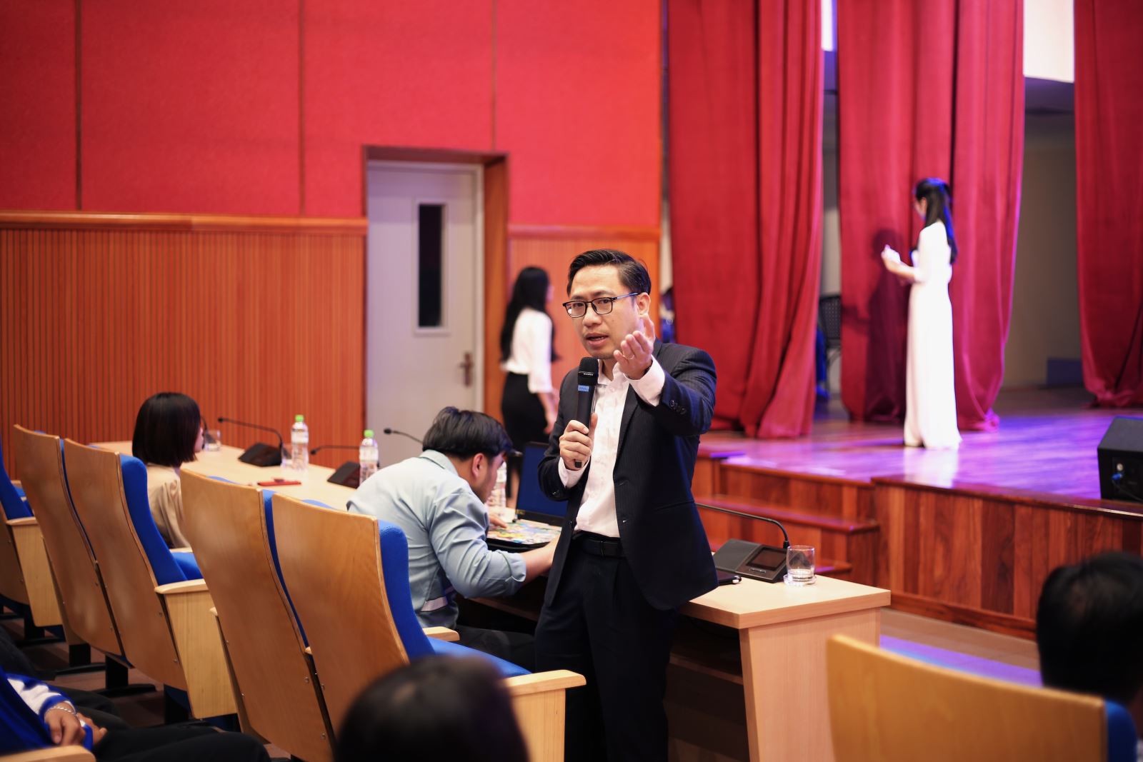 Hai diễn giả khách mời TS. Chu Đức Hà và TS. Tạ Văn Việt chia sẻ những góc nhìn thực tế, giúp sinh viên định hình hành trang nghề nghiệp tương lai.