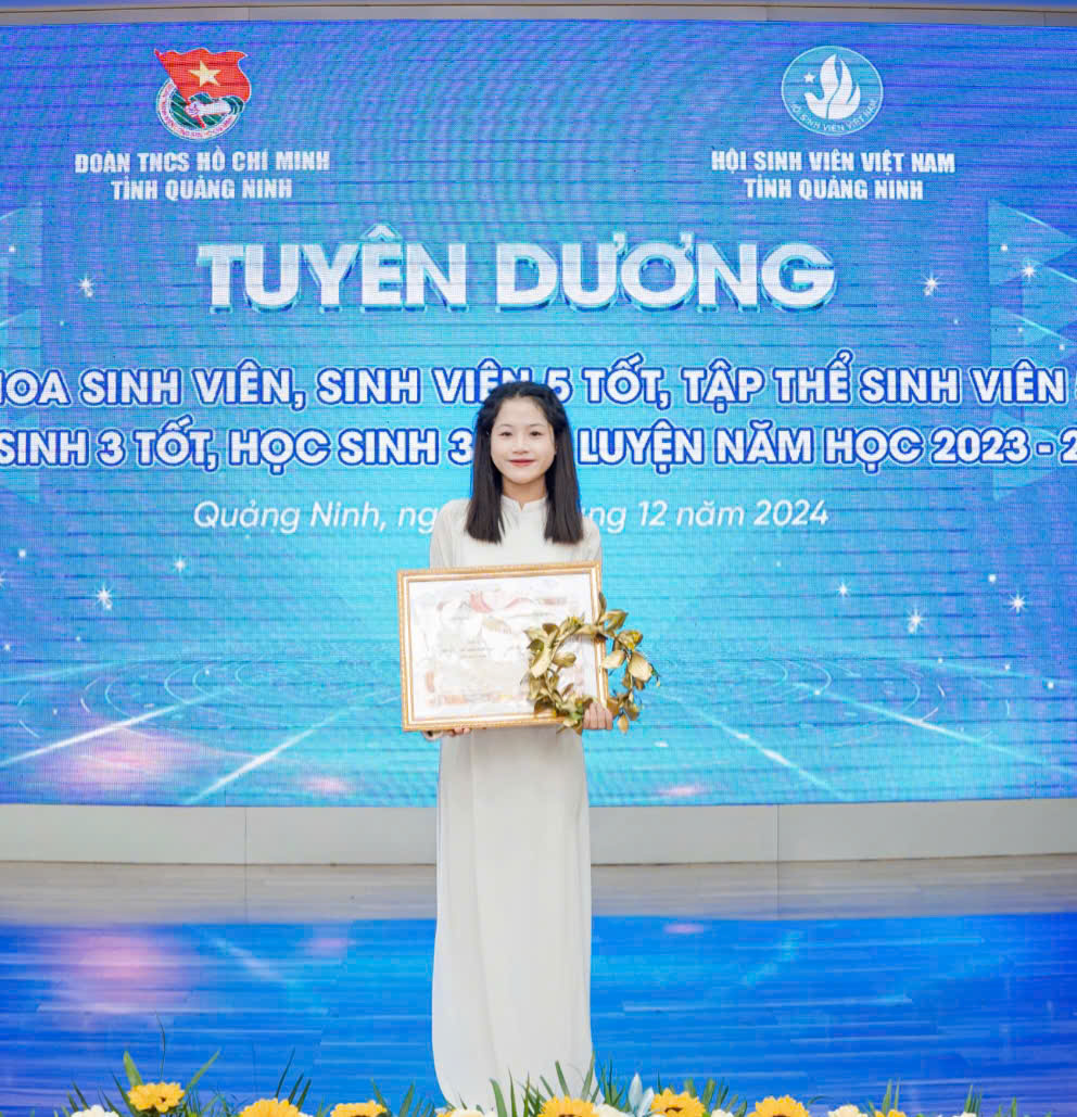 Trần Thị Trà My nhận Bằng khen Thủ khoa sinh viên cấp tỉnh năm 2024 - 2025 của Đoàn TNCS Hồ Chí Minh tỉnh Quảng Ninh.