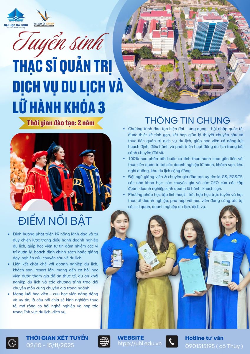 Trường Đại học Hạ Long chính thức thông báo tuyển sinh chương trình đào tạo trình độ Thạc sĩ ngành Quản trị Dịch vụ Du lịch và Lữ hành – Khóa 3, năm 2025.