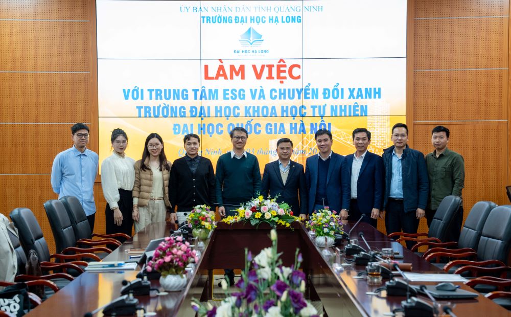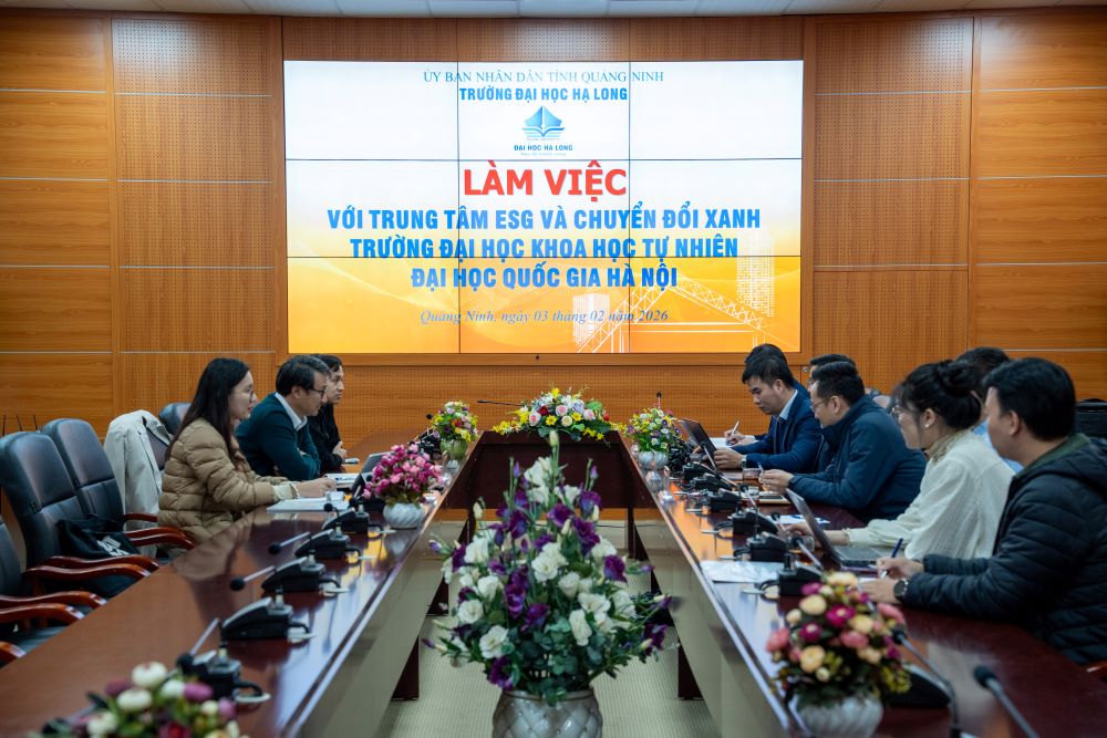 Sáng ngày 03/02/2026, Trường Đại học Hạ Long đã tổ chức chương trình đón tiếp và làm việc với Trung tâm ESG và Chuyển đổi xanh – Trường Đại học Khoa học Tự nhiên, Đại học Quốc gia Hà Nội, nhằm trao đổi, chia sẻ kinh nghiệm và định hướng hợp tác trong lĩnh vực môi trường, phát triển bền vững và chuyển đổi xanh.