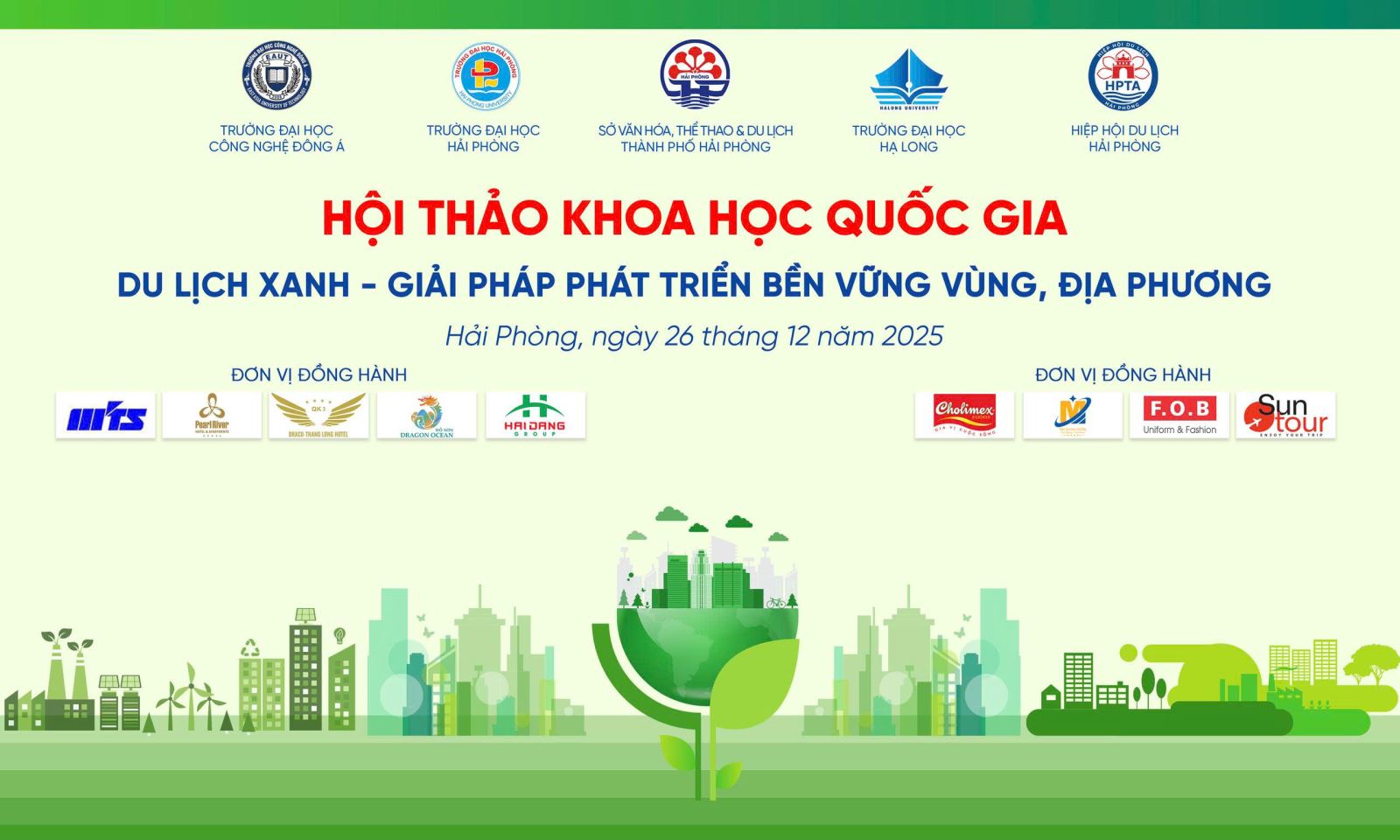 Ngày 26/12/2025, Hội thảo Khoa học quốc gia với chủ đề “Du lịch xanh – Giải pháp phát triển bền vững vùng, địa phương” sẽ được tổ chức tại Trường Đại học Hải Phòng. Hội thảo do Trường Đại học Hải Phòng chủ trì, phối hợp cùng Sở Văn hóa – Thể thao và Du lịch Hải Phòng, Hiệp hội Du lịch Hải Phòng, Trường Đại học Công nghệ Đông Á và Trường Đại học Hạ Long tổ chức.