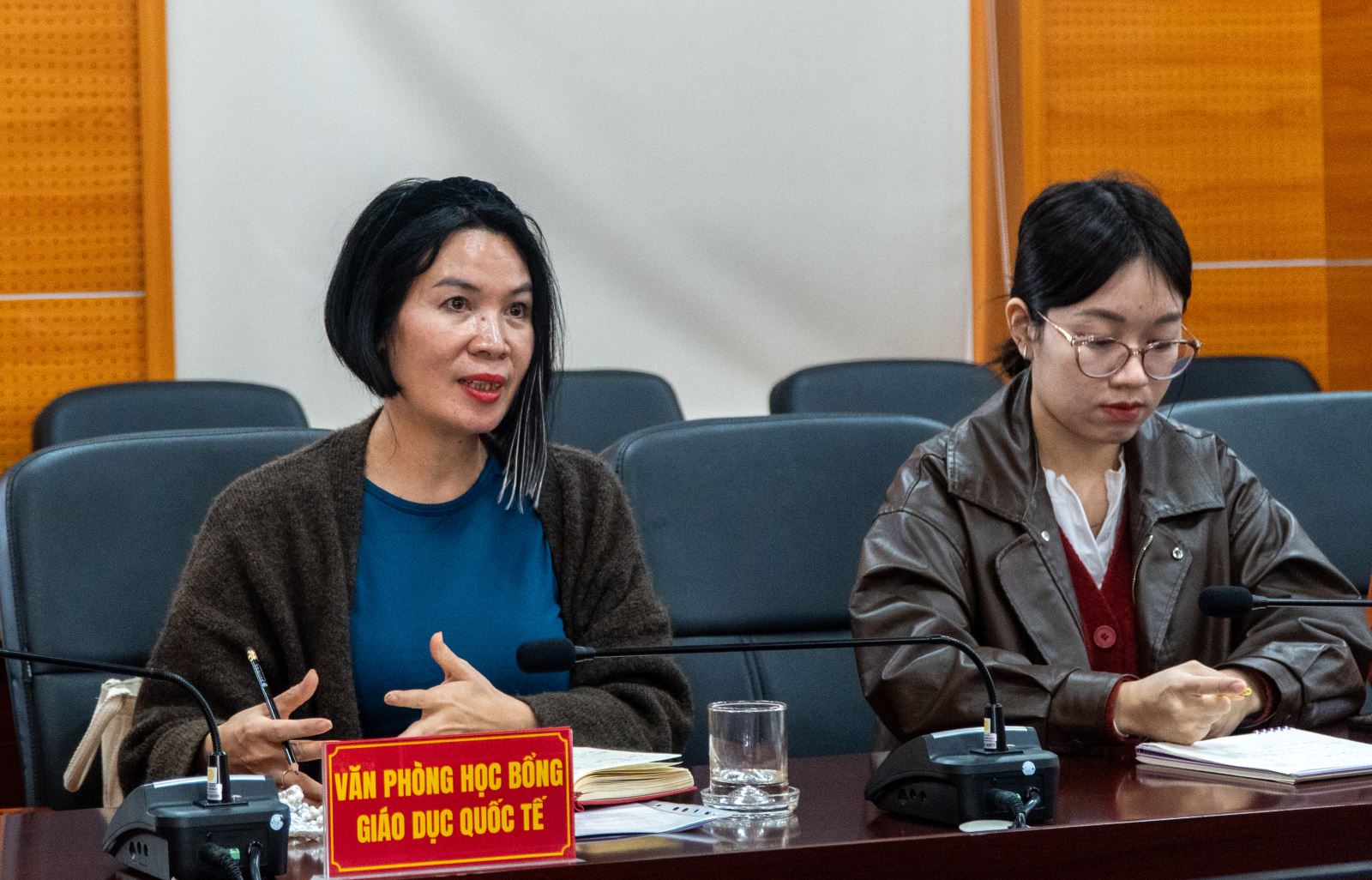 Cô Trần Huyền Anh - Giám đốc Văn phòng Học bổng Giáo dục Quốc tế phát biểu tại cuộc họp