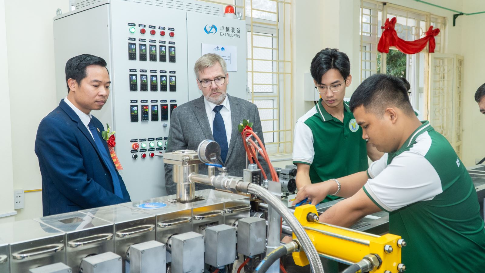 Ông Graf von Luxburg-Marten Welf Michael - Đại diện nhà tài trợ Dự án REVFIN từ Trường Đại học Ostfalia (Đức) giám sát vận hành thiết bị tại Không gian trình diễn tái chế