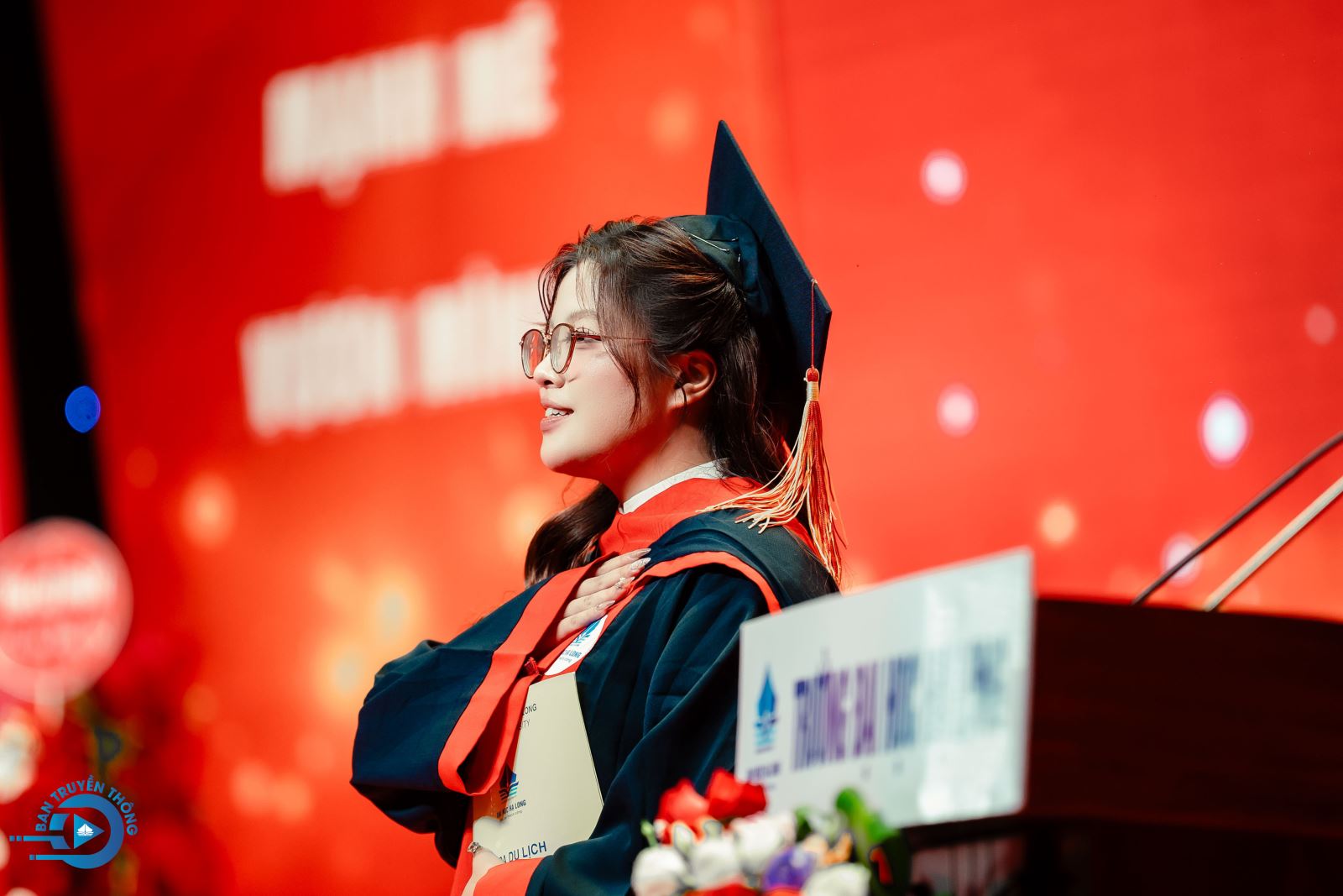 Đặc biệt, trong số 33 sinh viên tiêu biểu toàn khóa được tuyên dương tại buổi lễ, Khoa Du lịch tự hào có nhiều gương mặt nổi bật đã đạt thành tích cao trong học tập, nghiên cứu khoa học và phong trào sinh viên, tiêu biểu. Em Nguyễn Quỳnh Chi – lớp ĐH Quản trị khách sạn K6C vinh dự được đại diện sinh viên toàn trường phát biểu tại buổi lễ, là minh chứng rõ nét cho sự chuyên nghiệp và năng lực hội nhập mà Khoa Du lịch đã đào tạo.