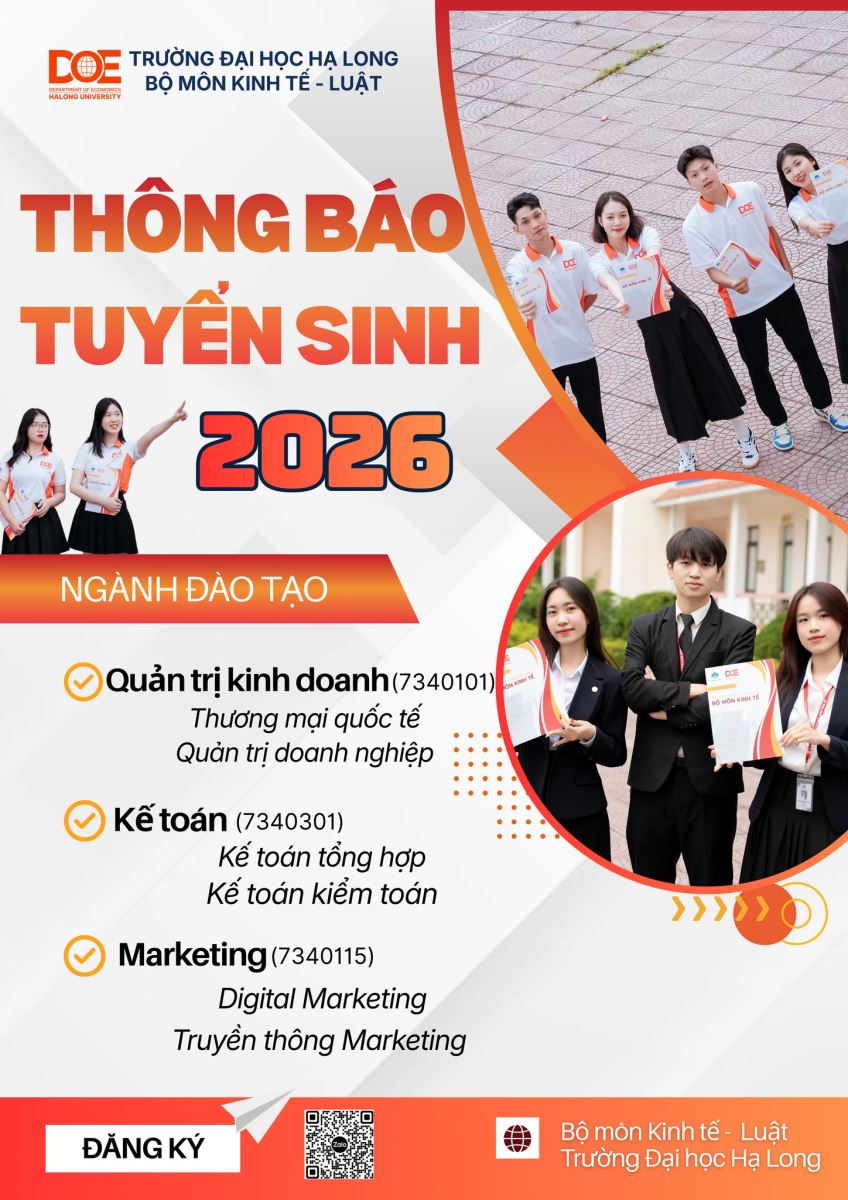 Nếu bạn đang tìm một ngành học năng động – dễ bắt trend – cơ hội việc làm rộng mở, thì tin vui là Bộ môn Kinh tế - Luật – Trường Đại học Hạ Long đã chính thức khởi động tuyển sinh 2026 rồi đây! Tại đây, bạn không chỉ học lý thuyết trên giảng đường mà còn được tiếp cận những kiến thức thực tế, kỹ năng làm việc và môi trường học tập cực kỳ năng động, nơi sinh viên có thể khám phá bản thân, phát triển tư duy kinh doanh và sẵn sàng bước vào thị trường lao động hiện đại.