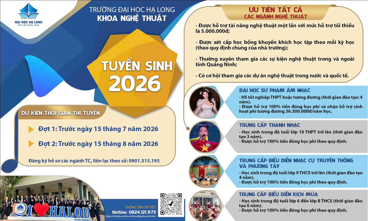 Khoa Nghệ thuật, Trường Đại học Hạ Long trân trọng thông báo tuyển sinh các chương trình đào tạo năm 2026, bao gồm hệ đại học và trung cấp các chuyên ngành nghệ thuật.Thí sinh quan tâm vui lòng đăng ký hồ sơ và liên hệ để được hướng dẫn chi tiết về điều kiện xét tuyển, thi năng khiếu (nếu áp dụng) và các thủ tục liên quan.
