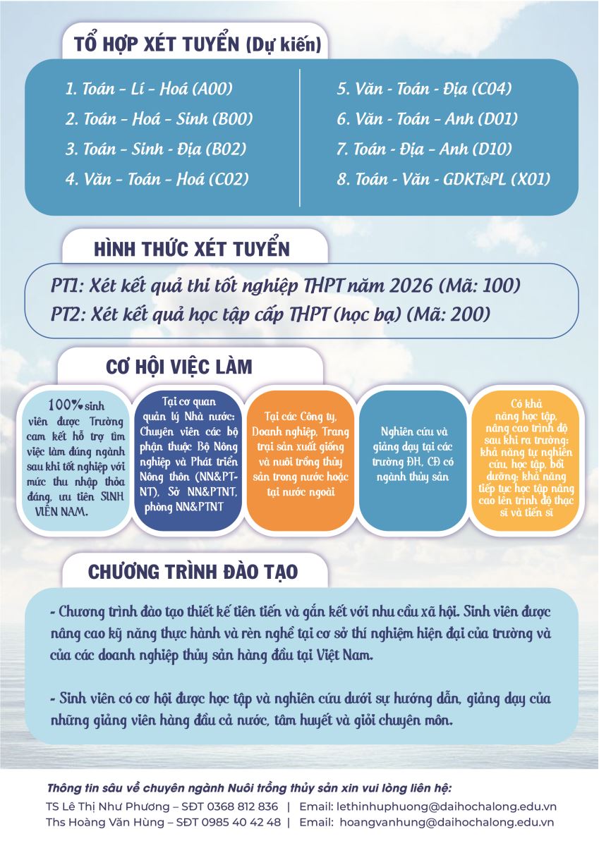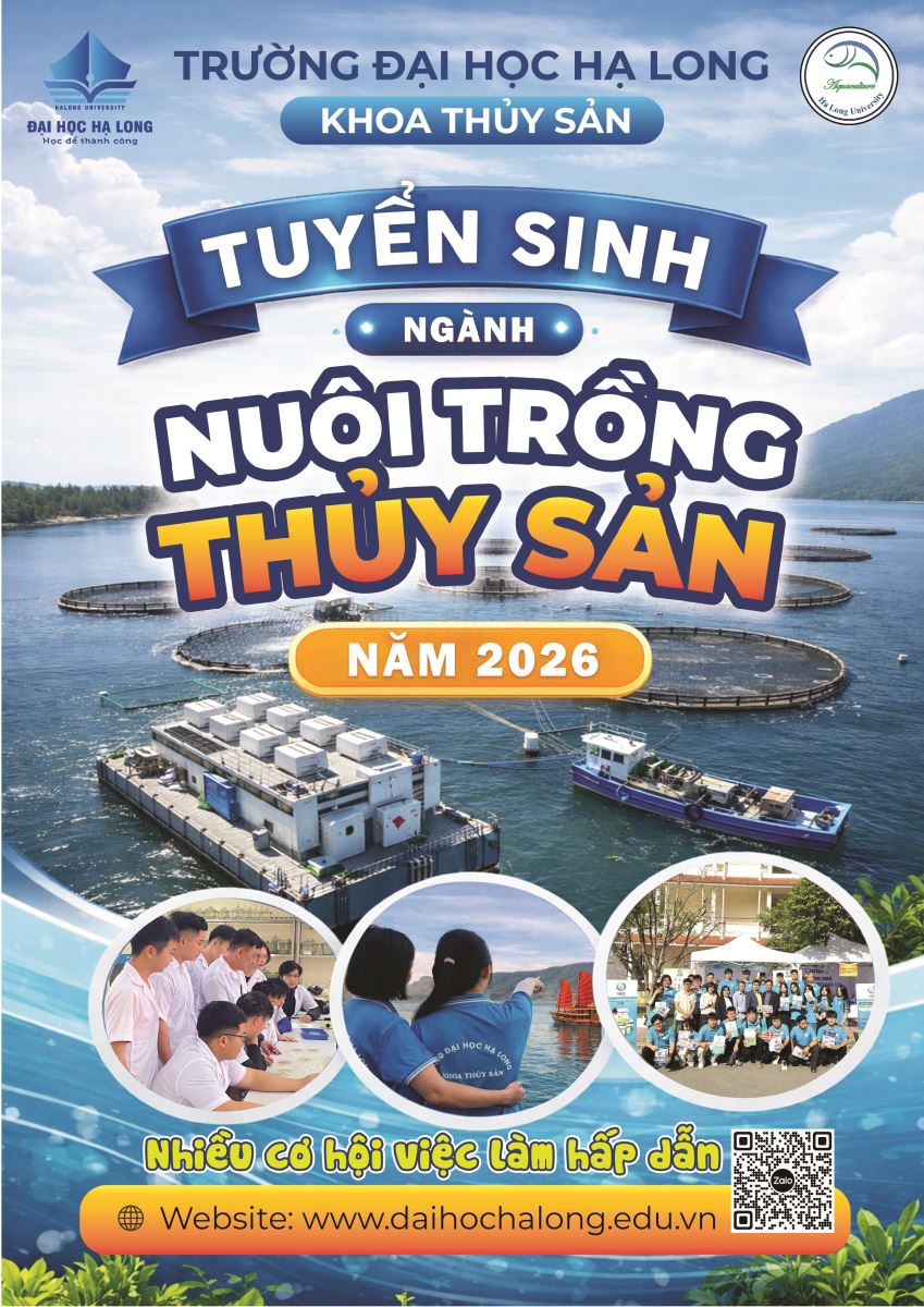 Khoa Thủy sản Đại học Hạ Long đào tạo chuyên sâu ngành Nuôi trồng Thủy sản – kết hợp giữa lý thuyết và thực hành trong phòng thí nghiệm & mô hình nuôi thực tế. Sinh viên có cơ hội thực tập tại Viện, tham gia đề tài nghiên cứu thực tiễn và ứng dụng kỹ thuật hiện đại. Với môi trường học tập năng động, định hướng nghề nghiệp rõ ràng, đây là lựa chọn phù hợp cho bạn yêu thích nghiên cứu, làm việc gắn liền với sông – biển – tài nguyên thủy sản.