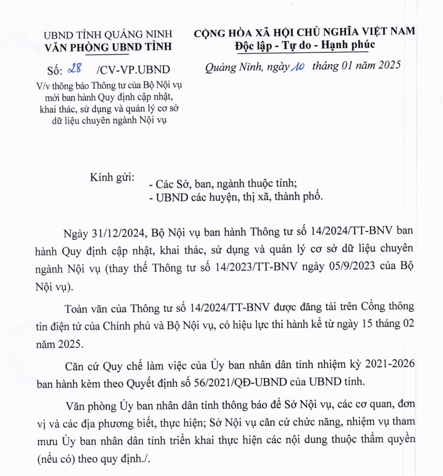 V/v thông báo Thông tư của Bộ Nội vụ mới ban hành Quy định cập nhật, khai thác, sử dụng và quản lý cơ sở dữ liệu chuyên ngành Nội vụ