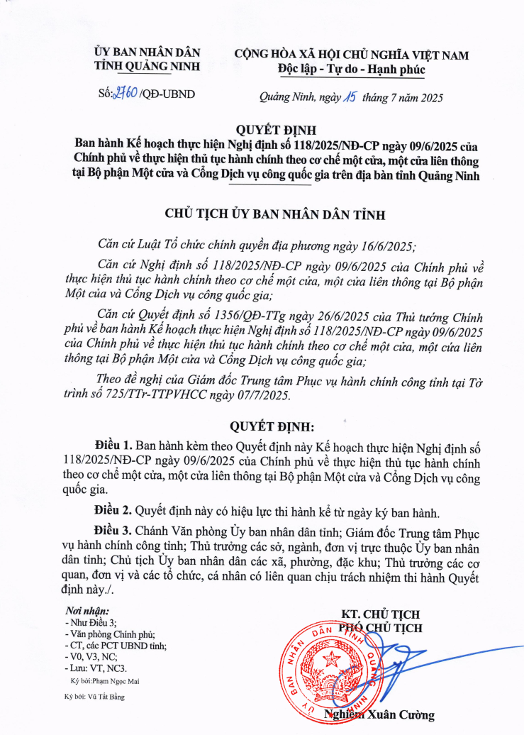 QUYẾT ĐỊNH Ban hành Kế hoạch thực hiện Nghị định số 118/2025/NĐ-CP ngày 09/6/2025 của Chính phủ về thực hiện thủ tục hành chính theo cơ chế một cửa, một cửa liên thông tại Bộ phận Một cửa và Cổng Dịch vụ công quốc gia trên địa bàn tỉnh Quảng Ninh
